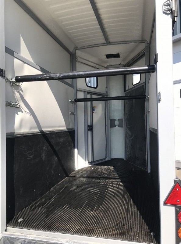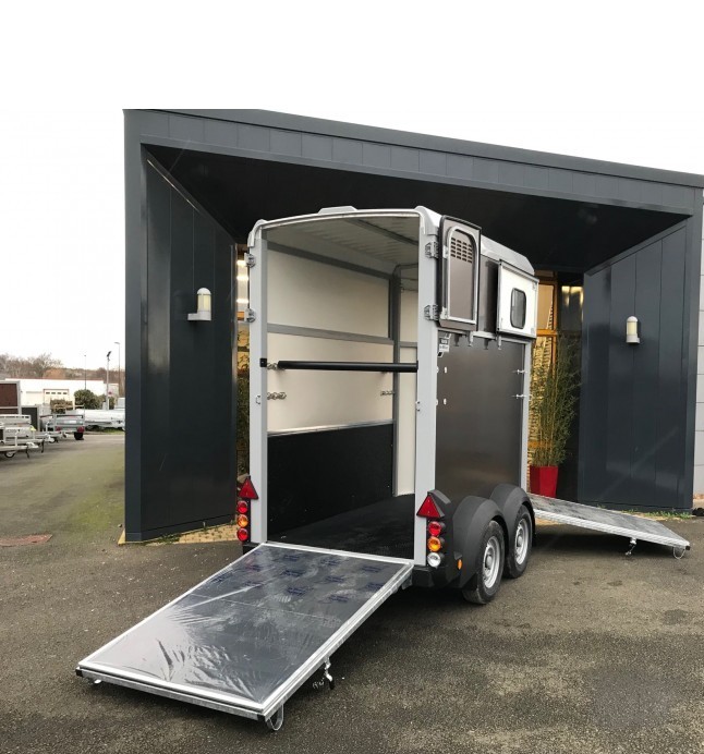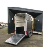 Le HBX 506 2 places est idéal pour transporter deux chevaux. Il est équipé de série de deux vitres latérales, d'une grande fenêtre avant, de longerons latéraux, d'un portail et de barres de recul. Pour les propriétaires de fourgons recherchant une polyvalence accrue, le pont de portail standard est idéal. Fonctionnant comme un pont pour le chargement des chevaux, il peut également s'ouvrir comme une porte latérale, permettant ainsi à un chariot élévateur de chargeur d'objets lourds dans le fourgon.